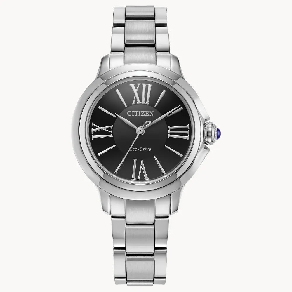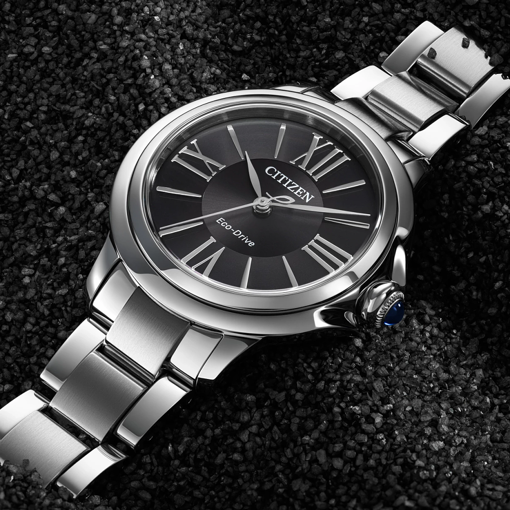 When it comes to elegant watches for women, the Ceci is a striking addition to any collection. Featuring a silver-tone stainless steel design with a case measuring 31.5mm across, its distinct shape is punctuated by a synthetic sapphire-set crown. On the dial, a black display features silver-tone accents, with the slim lines of the Roman numeral indices matching those of the hands. With this watch, you'll never need to worry about replacing a battery — this watch is sustainably powered by any light with our proprietary Citizen Eco-Drive technology. Whether you’re looking for a dress watch for special occasions or a beautiful timepiece to wear every day, the Ceci will look stunning on every wrist and elevate your style. Water resistant to 50 meters. Caliber E031.
