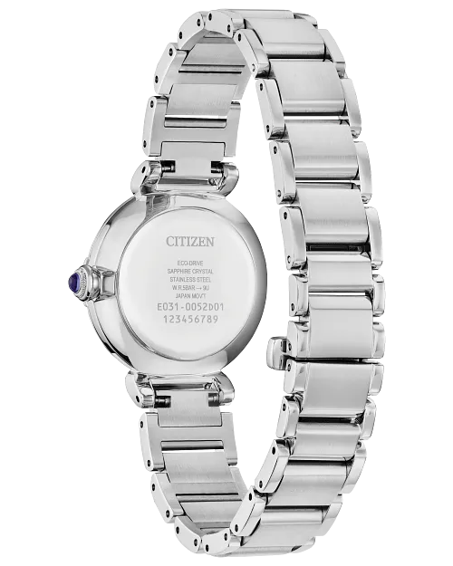 Inspired by the beautiful oceans that unite the world, the watches of Citizen's UNITE with BLUE series join the colors of the seven seas on one 100% recycled polycarbonate dial. Highlighting... Citizen's commitment to sustainability, the series now includes models from the Promaster Dive, CITIZEN xC, Attesa, and Sport Luxury lines. This example, CITIZEN L UNITE with BLUE Mae, embodies an elegant styling that is entrancing on the wrist. A stainless steel case in a silver-tone provides the foundation for the look, with its 29.5mm diameter adding a subtlety in wear that perfectly balances its synthetic sapphire-set crown and integrated bracelet. The nautical-inspired, iridescent blue dial features diamond accents and quickly evokes the waves of the sea, while a sapphire crystal above adds clarity to the display's details. Sustainably powered by any light with our proprietary Eco-Drive technology that never needs a battery, this elegant women’s watch is the perfect dressed up look with high-powered performance. Water resistant up to 50 meters. Caliber E031. Limited to 2000 pieces worldwide.