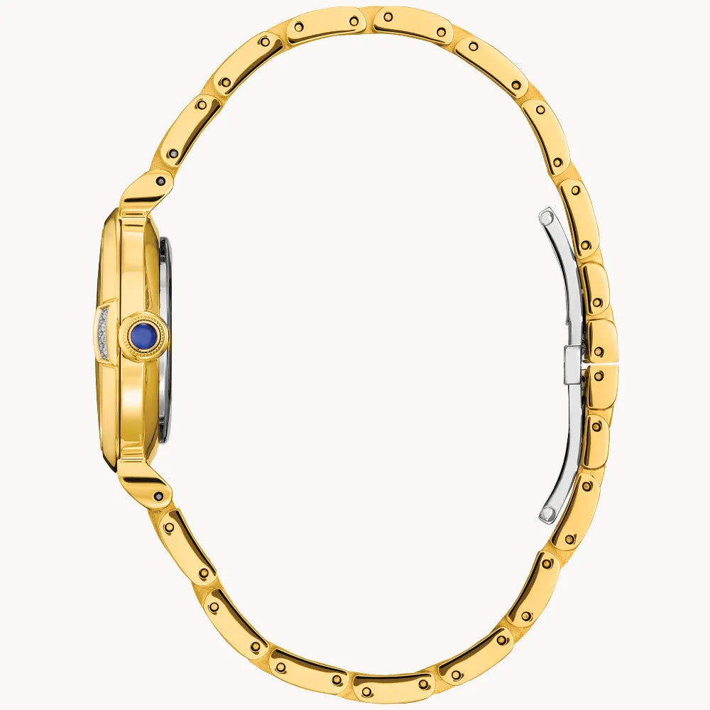 Classic lines and hints of romance make this newest piece to our ladies' collection, the Citizen L Mae, a glamorous addition of sustainable luxury. With a case design inspired by a vintage perfume bottle and featuring the curved, sleek lines of May bells, the bezel shape has a distinct feature at the 3 o’clock position, where the crown resembles an elegant perfume stopper. Featuring a white, mother-of-pearl dial made of recycled materials, including a recycled polycarbonate base under the dial, and showcased on a sleek, gold-tone stainless steel case and bracelet. The dial also has a diamond that gives focus to the 8 o’clock position and is finished with a sapphire crystal. Sustainably powered by any light with our proprietary Eco-Drive technology that never needs a battery, this elegant women’s watch is the perfect dressed up look with high-powered performance. Caliber E031.