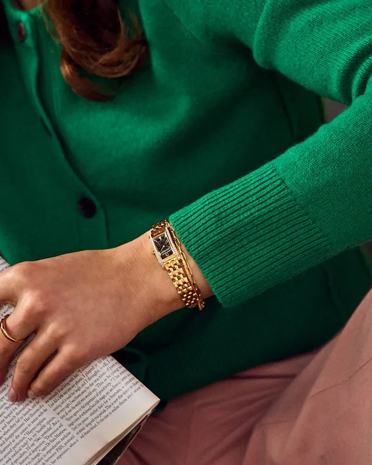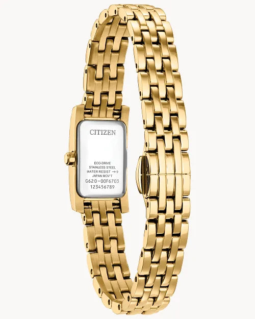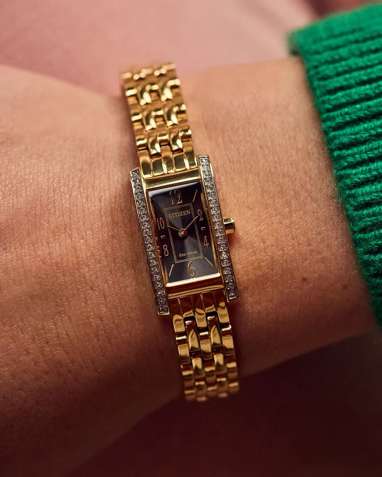 Inspired by the elegant, elongated shape of the original, the Petite Palidoro reissue is the latest women’s watch in our Dress Classic collection and is the perfect complement for elegant wear. On... the wrist, the timepiece measures 28mm in gold-tone stainless steel, with its rectangular form accented by crystals on either side of the bezel and a lovely geometric crown. A matching five-link bracelet effortlessly secures the watch to the wrist. The black dial is as much an exercise in sophisticated art deco as the case, with stylized Arabic numerals being framed in creative fashion while shortened hour and minute hands indicate the time. Sustainably powered by any light with our proprietary Eco-Drive technology that never needs a battery, this elegant ladies’ watch is the perfect addition to any look. Caliber G620.