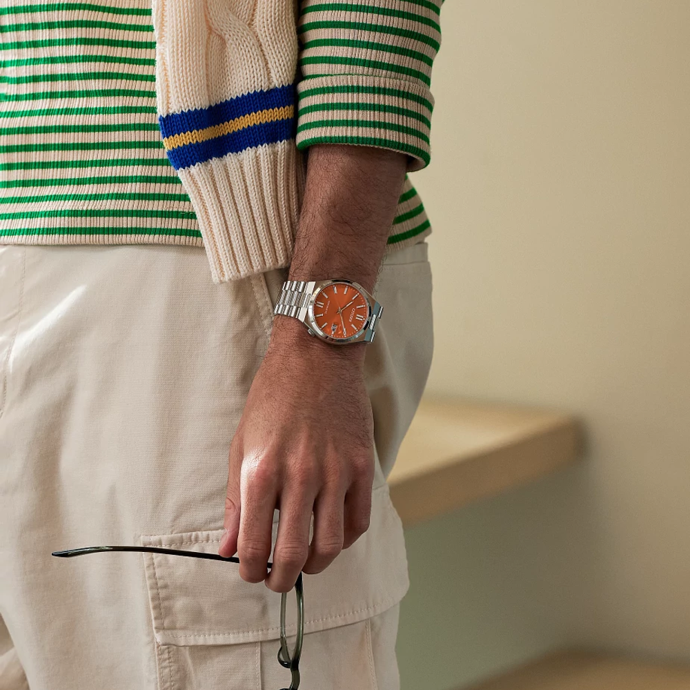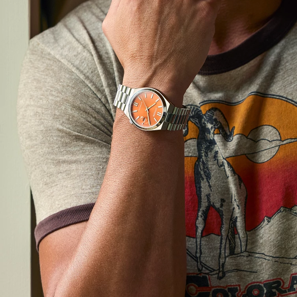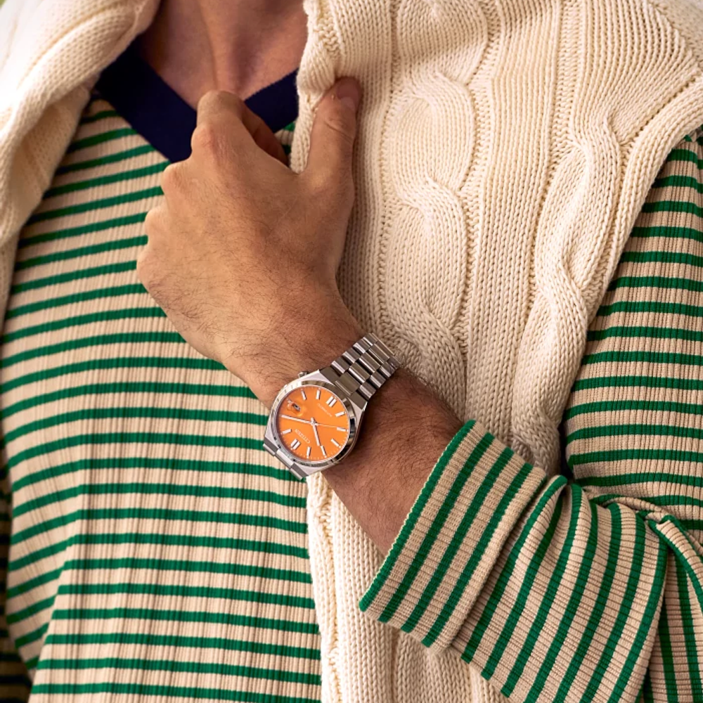 The Tsuyosa Automatic, from the NJ015 series, brings ultramodern sports styling right to your wrist. Executed in a versatile 40mm footprint, the sophisticated design of the watch makes a strong impression via a silver-tone stainless steel case and a seamlessly integrated, matching bracelet. Underneath an anti-reflective sapphire crystal, the sporty timepiece makes use of a sunray orange dial, with a 3 o’clock date window and contrasting silver-tone details adding to its classic aesthetic. Powered by an automatic movement and offering up to 50 meters of water resistance, the refined timepiece is a daily wearing choice ready for work, play, and everything in between. Caliber 8210.