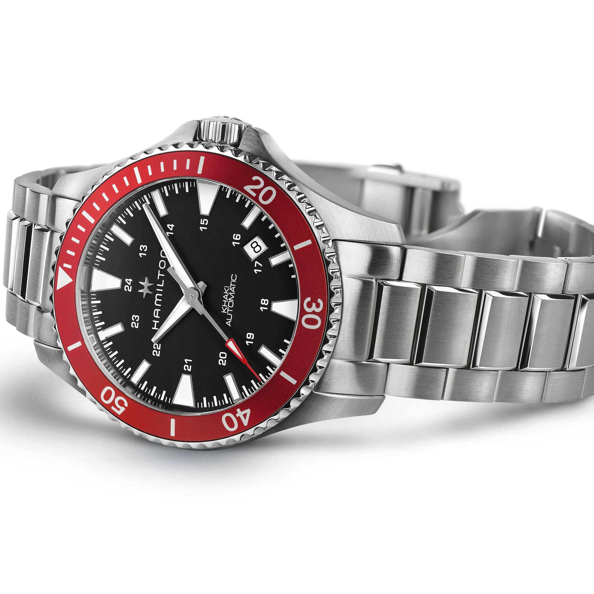 The 40mm Khaki Navy Scuba Automatic features a red aluminum bezel with a sandblasted finish, for a softer, deeper tone and muted shine. Inspired by the marine universe, bright red is reminiscent of flaming red ocean rescue teams and the left side of sailing boats (portside). Powered by our H-10 automatic movement, this timepiece is the perfect choice for those who appreciate both style and performance. Appealing and ubiquitous, the red colorway adds a unique edge to the Khaki Navy Scuba, making it a timeless companion for any challenge, from aquatic explorations to urban adventures.