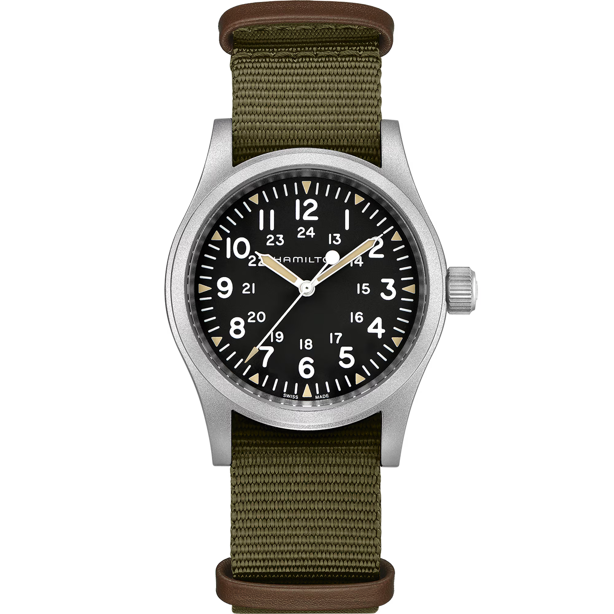 38mm matt stainless steel case, three hand display, dark dial with light, luminescent numerals, indexes showing hours and minutes, durable NATO strap: The new Khaki Field Mechanical is a faithful recreation of its original 1960s forebear and is true to Hamilton's military heritage. Inspired by the military, built to last, this is the original soldier's watch.