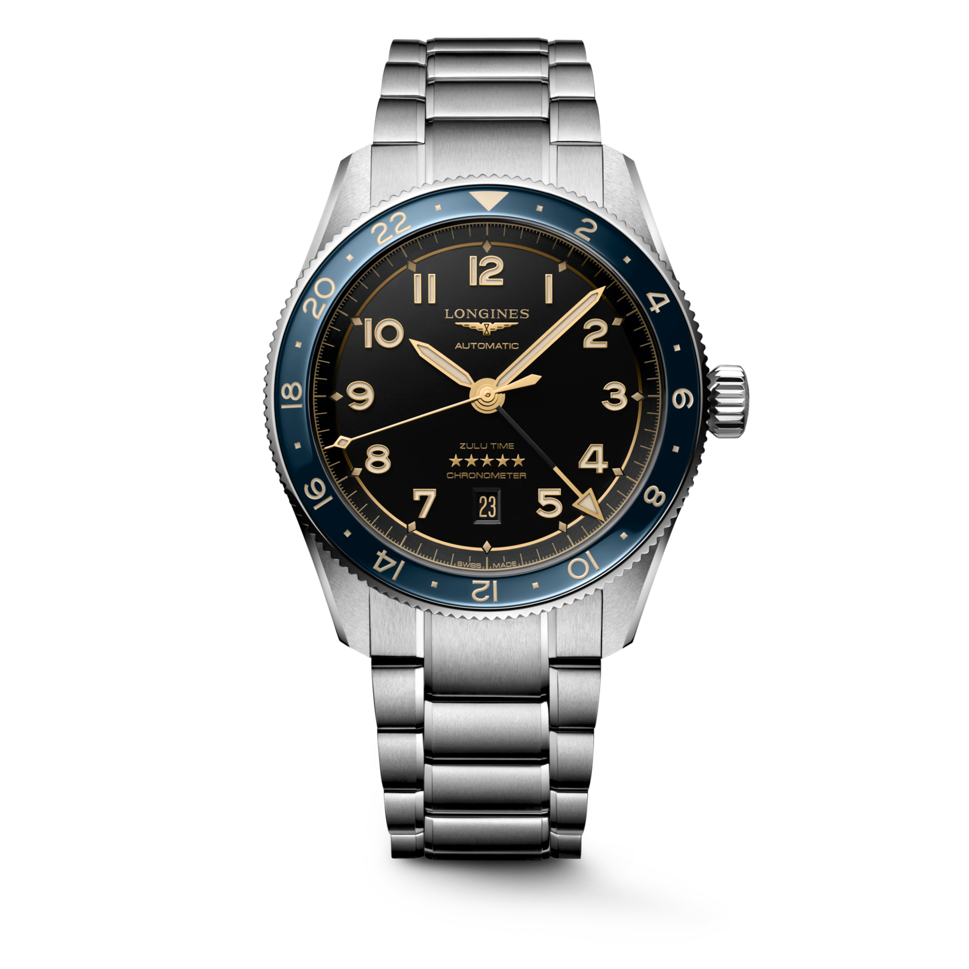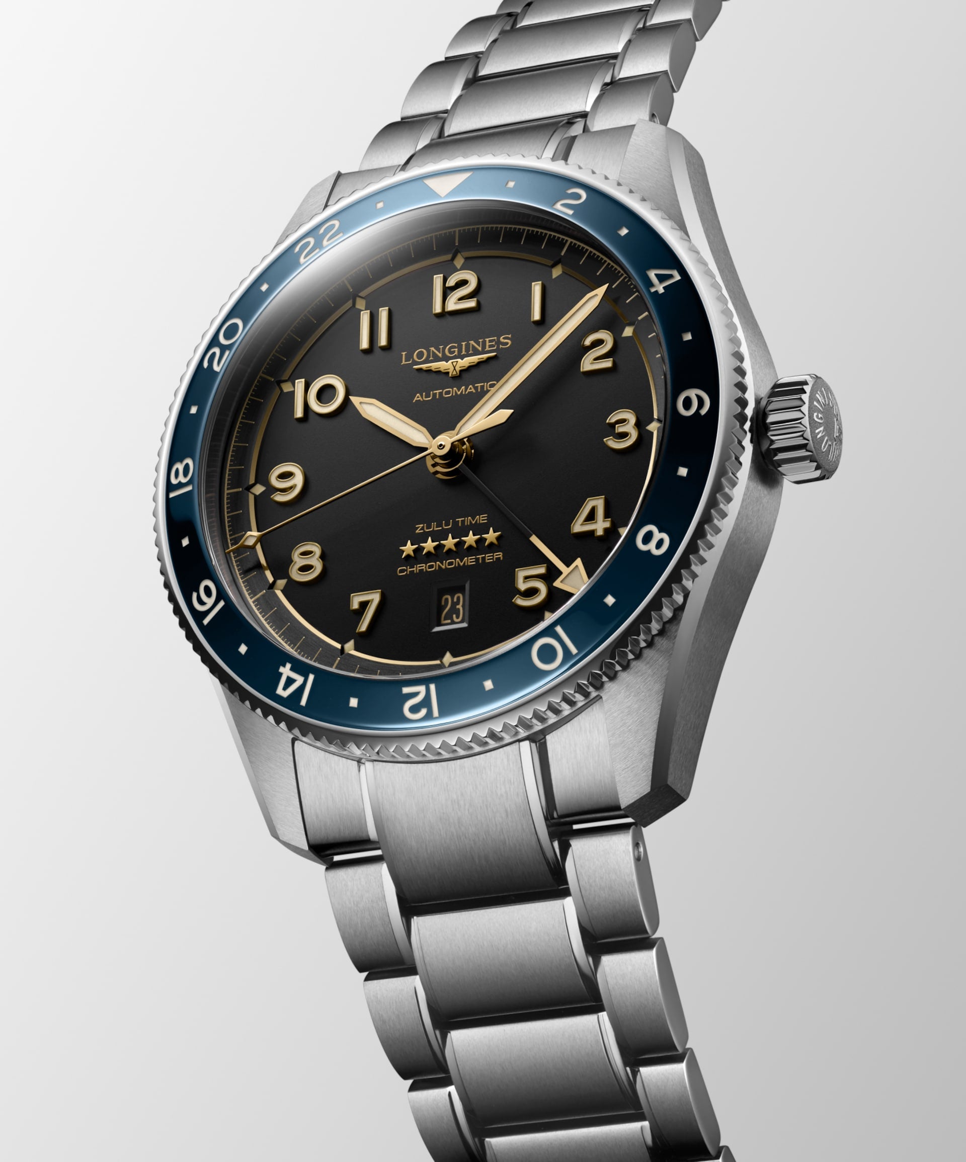 The LONGINES Spirit Zulu Time typifies the brand’s century-old expertise in timepieces with multiple time zones. Its origins and its name come from the first LONGINES dual time zone wristwatch manufactured in 1925, which featured the Zulu flag on its dial – Zulu referring to the letter “Z” that designates universal time for aviators. Aesthetically, the LONGINES Spirit Zulu Time stands out with its meticulous execution and the particular care given to the various details. It features a bidirectional rotating bezel with a ceramic insert. Each model is powered by an exclusive LONGINES calibre, equipped with a silicon balance-spring, resistant to magnetic fields and chronometer-certified by the COSC.
