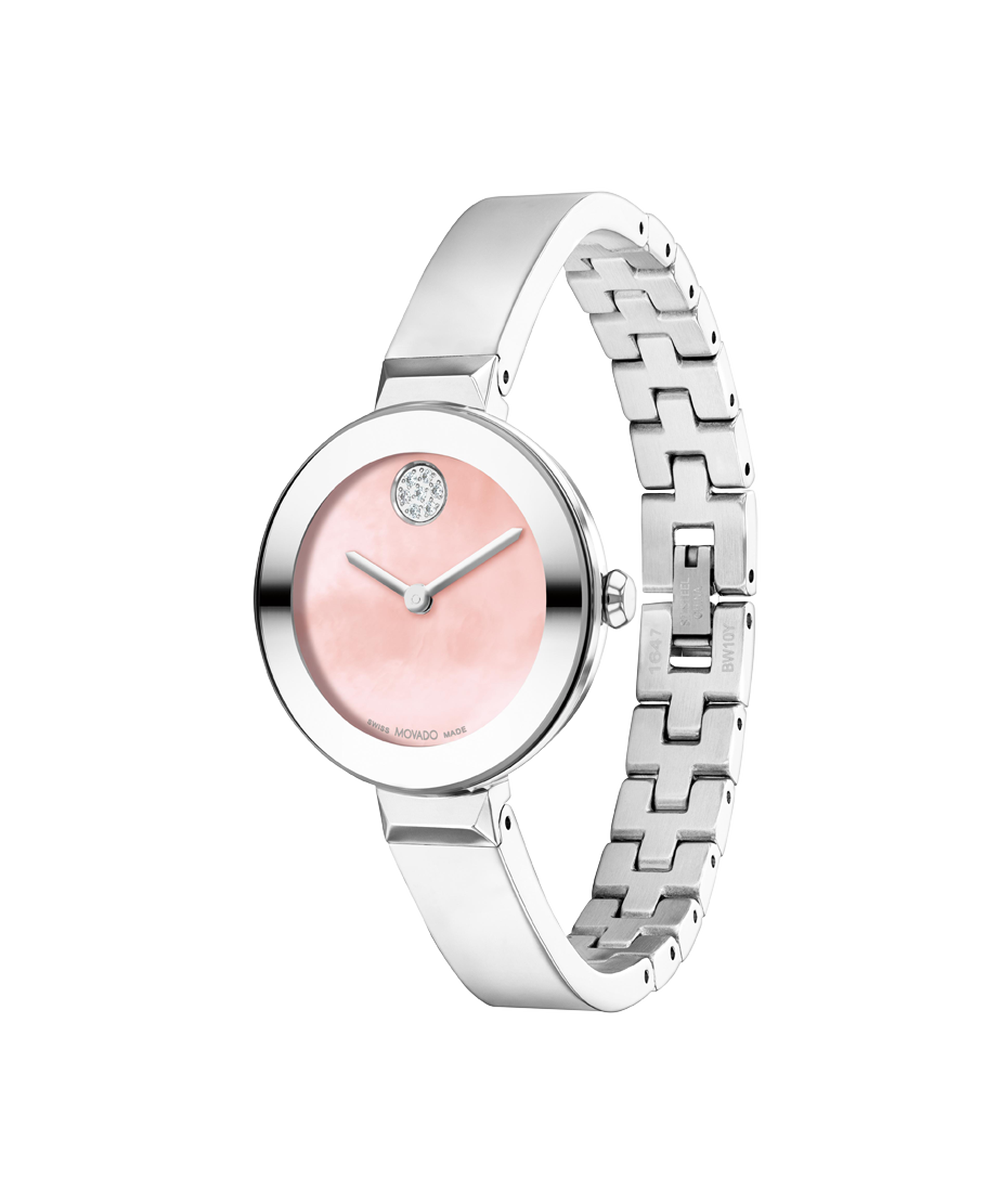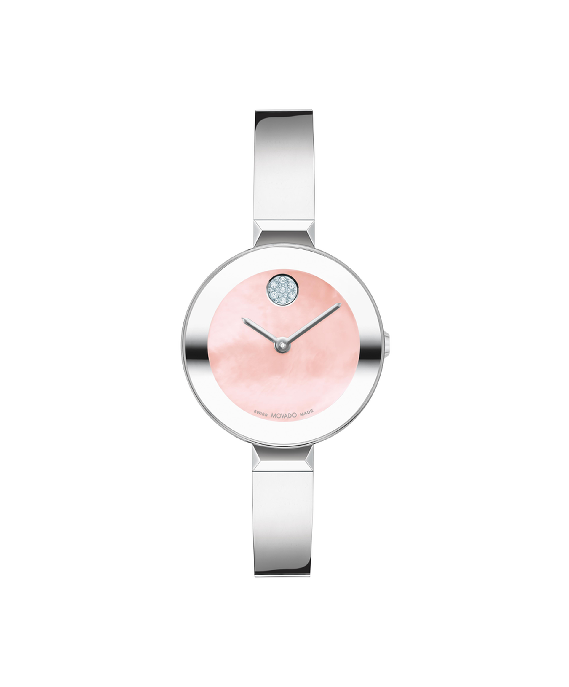 The Bold Bangle is defined by an elevated, Bold case and an intergrated jewelry-inspired bracelet. This 28mm watch features a pink sunray dial with a mother-of-pearl overlay, slim steel hands, and a crystal pavé dot at 12 o'clock. Mother-of-Pearl dials may vary in color as each piece is unique making every watch one of a kind.