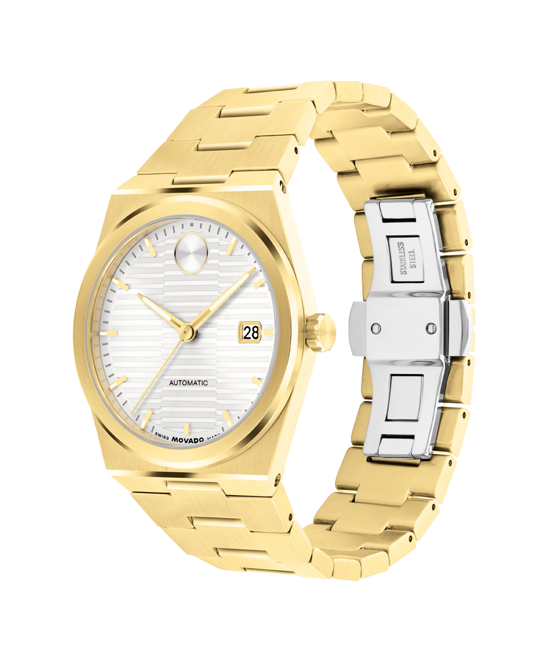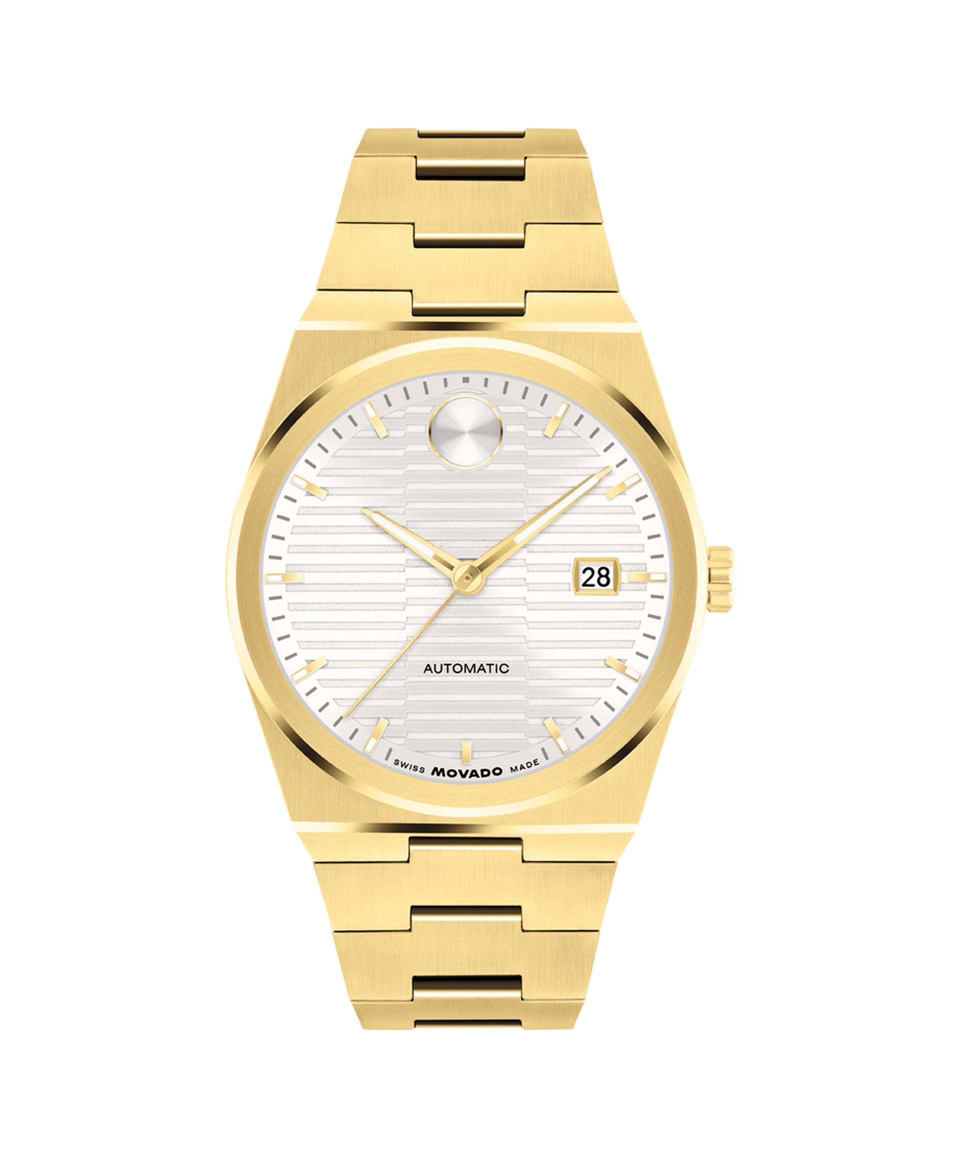The Bold Quest Automatic looks to the future with a shaped case and an integrated bracelet. A Swiss made self-winding movement drives this watch, powered by the motion of your wrist. This 39mm watch features a white dual texture dial, yellow gold-tone hands, an exhibition case back, and our signature dot at 12 o'clock.