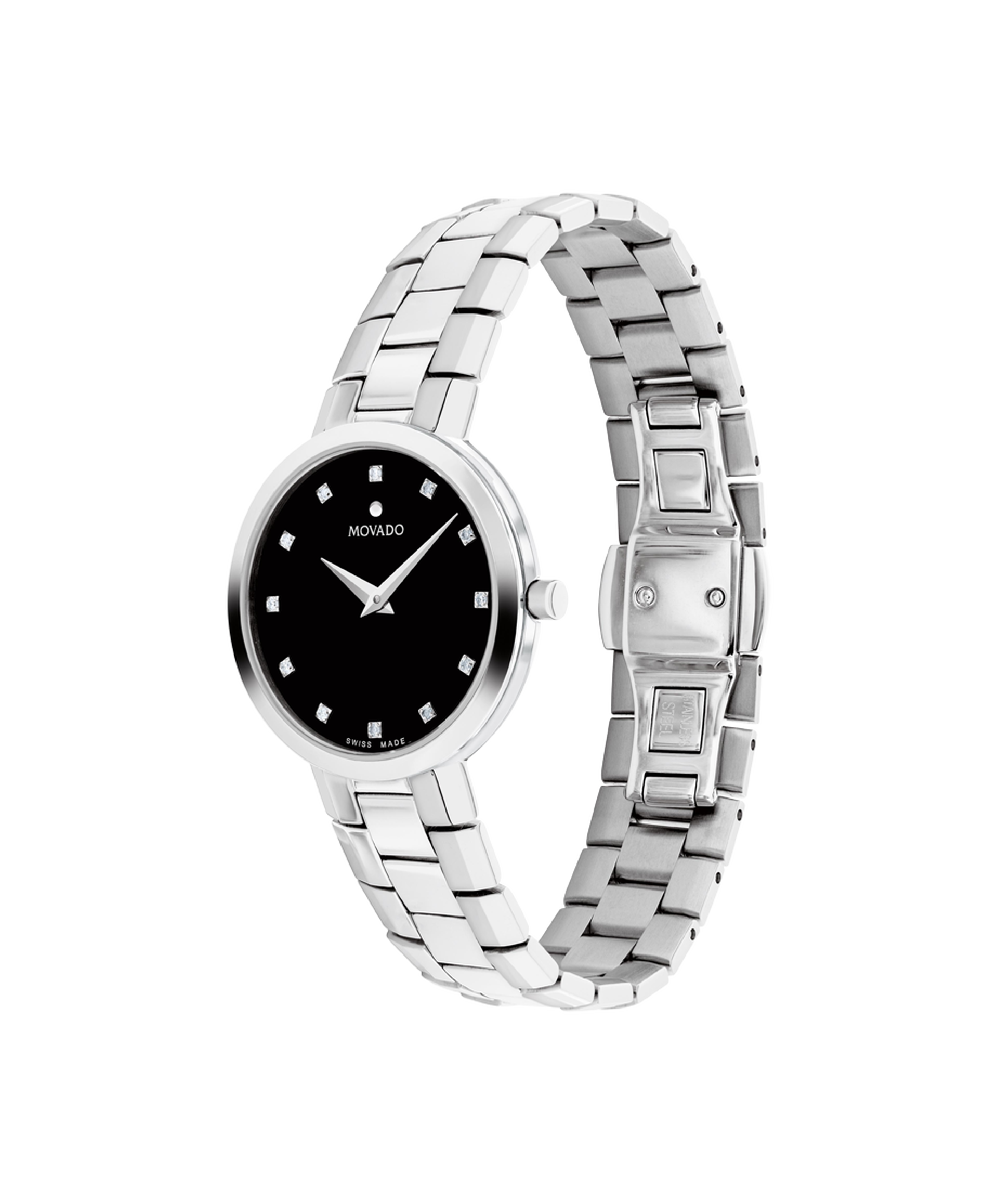 The Faceto represents the height of modern luxury. This 28mm watch features a black enamel dial with diamond hour markers, and steel dauphine hands.