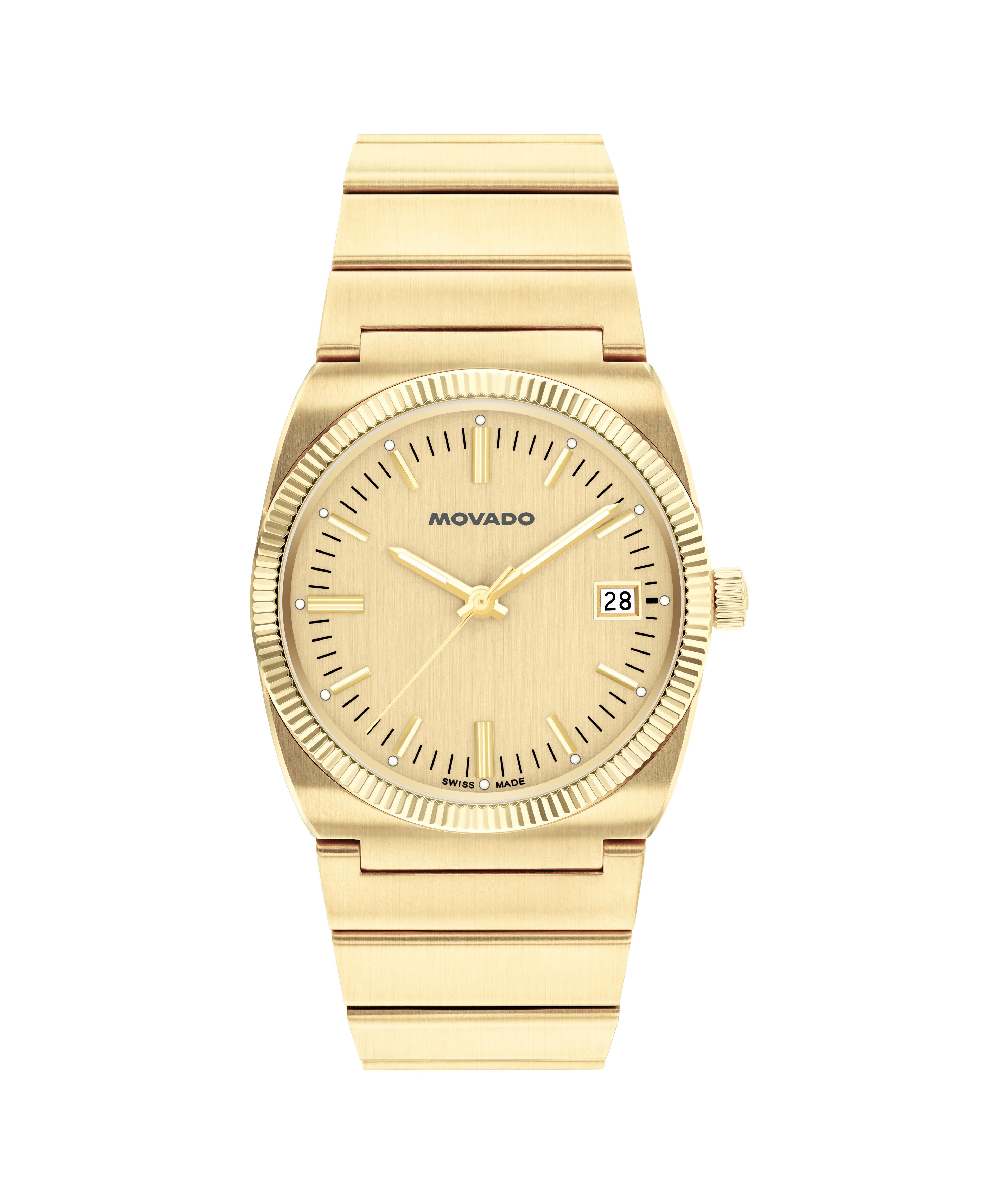 The Heritage Series Ondoplan echoes the distinctive styling of our 1970s Electronic Surf Series, highlighted by a wave-inspired fluted bezel and integrated bracelet. This 36mm watch features a pale gold dial, fluted bezel, and yellow gold-tone hands.