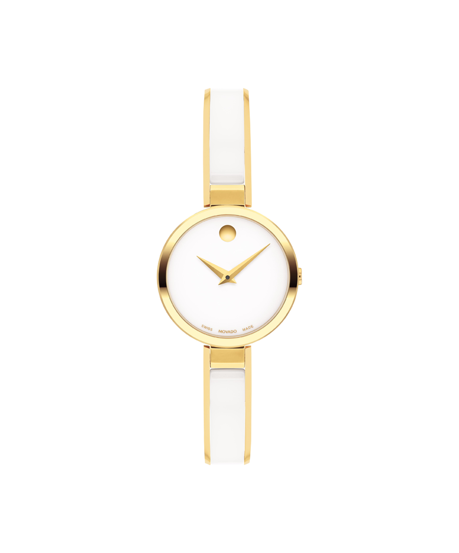Redefining modern elegance. Iconic design meets feminine style in our new Moda Collection. This sophisticated bangle features a slim yellow gold PVD-finished bracelet and sleek white ceramic inlay paired with a chic 24mm case framing our signature Museum dial.