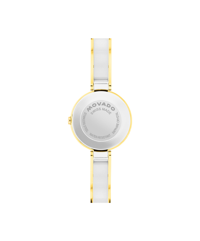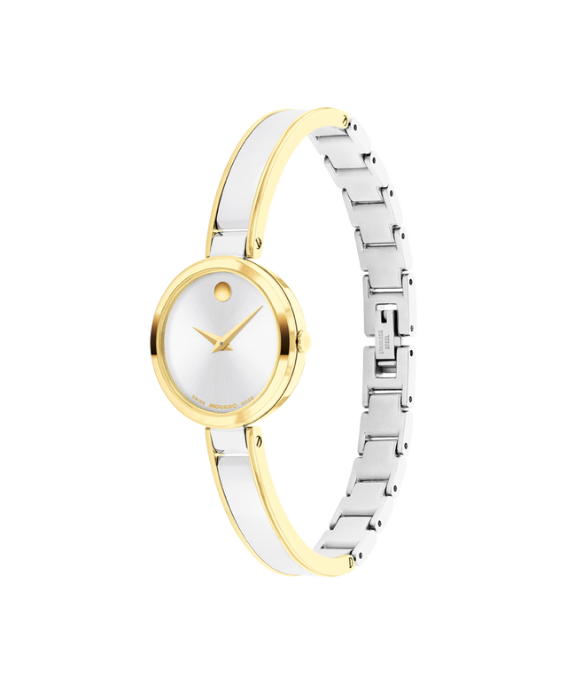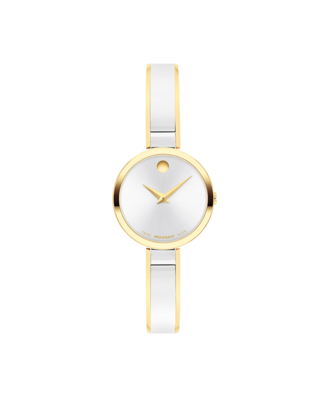 The Moda is defined by a slim, jewelry-inspired bracelet and our iconic Museum Dial. This 24mm watch features a silver white sunray dial, yellow gold tone dauphine hands, and a bangle bracelet.