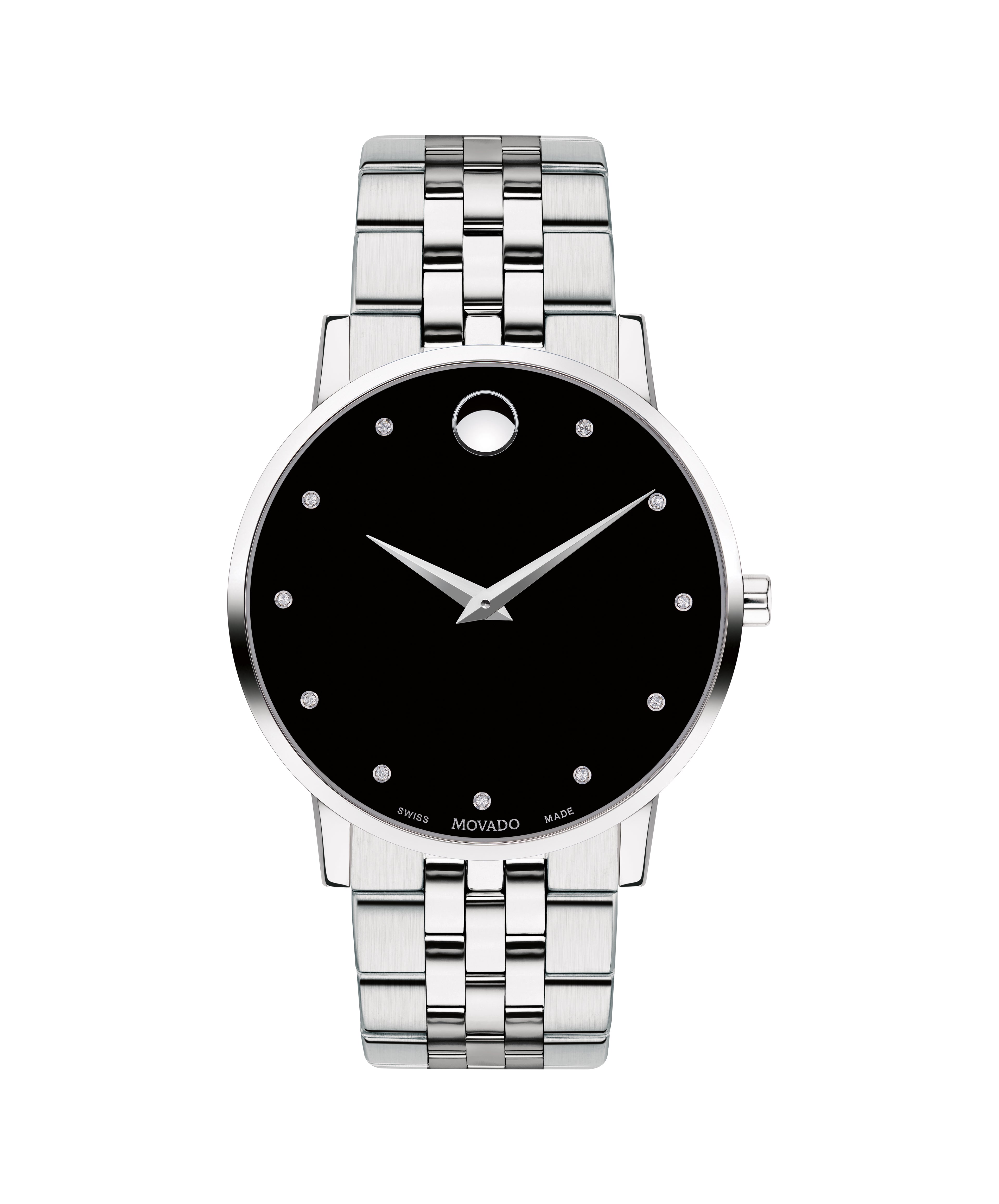 Men's Museum Classic watch, 40 mm stainless steel case, round black dial with 11 diamond markers (0.043 t.c.w.) and silver-toned dot and hands, stainless steel link bracelet with deployment clasp.