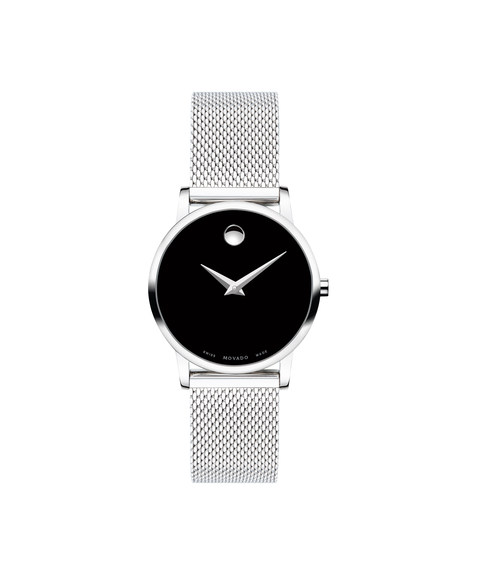 Women's Museum Classic watch, 28 mm stainless steel case, black Museum dial and silver-toned dot and hands, stainless steel mesh bracelet with sliding closure clasp.