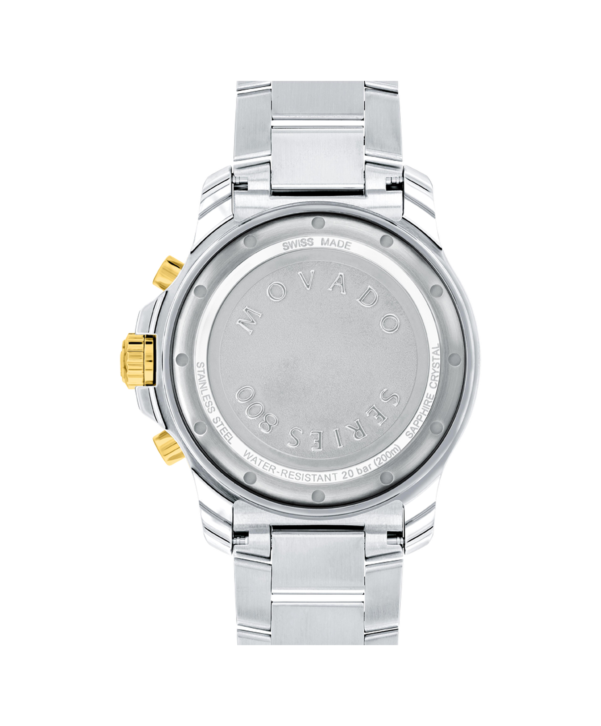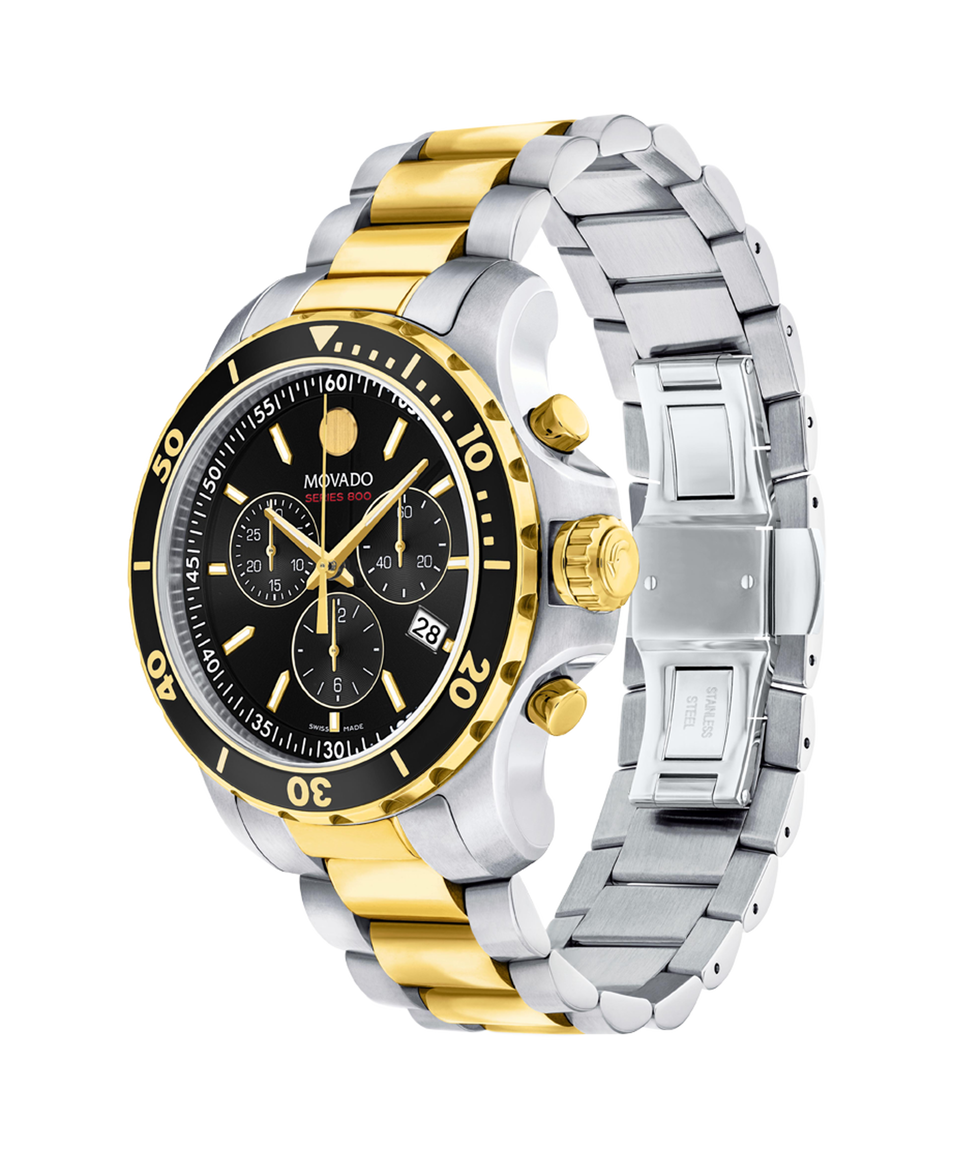 Movado Series 800, 42 mm stainless steel and yellow gold PVD-finished case and bracelet with black chronograph dial.