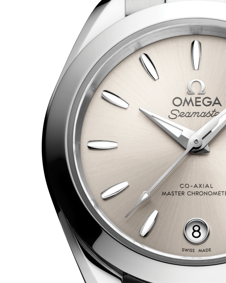 The Seamaster Aqua Terra is a superb tribute to OMEGA’s rich maritime heritage. This slim 30 mm model achieves its refined proportions through OMEGA's innovative Co-Axial Master Chronometer calibre 8750, certified at the industry's highest standard by the Swiss Federal Institute of Metrology (METAS). This stainless steel model has a symmetrical polished case and features a screw-in caseback with wave-edged design. The sandstone dial is sun-brushed and coloured with tinted lacquer, with a circular date window at 6 o’clock. It is highlighted by 11 boat hull-shaped indexes and redesigned faceted hands, with the minute hand tapering to a delicate point. All the applied elements and hands are in 18K white gold, while the indexes and hands are also filled with white Super-LumiNova which emits a blue glow.
