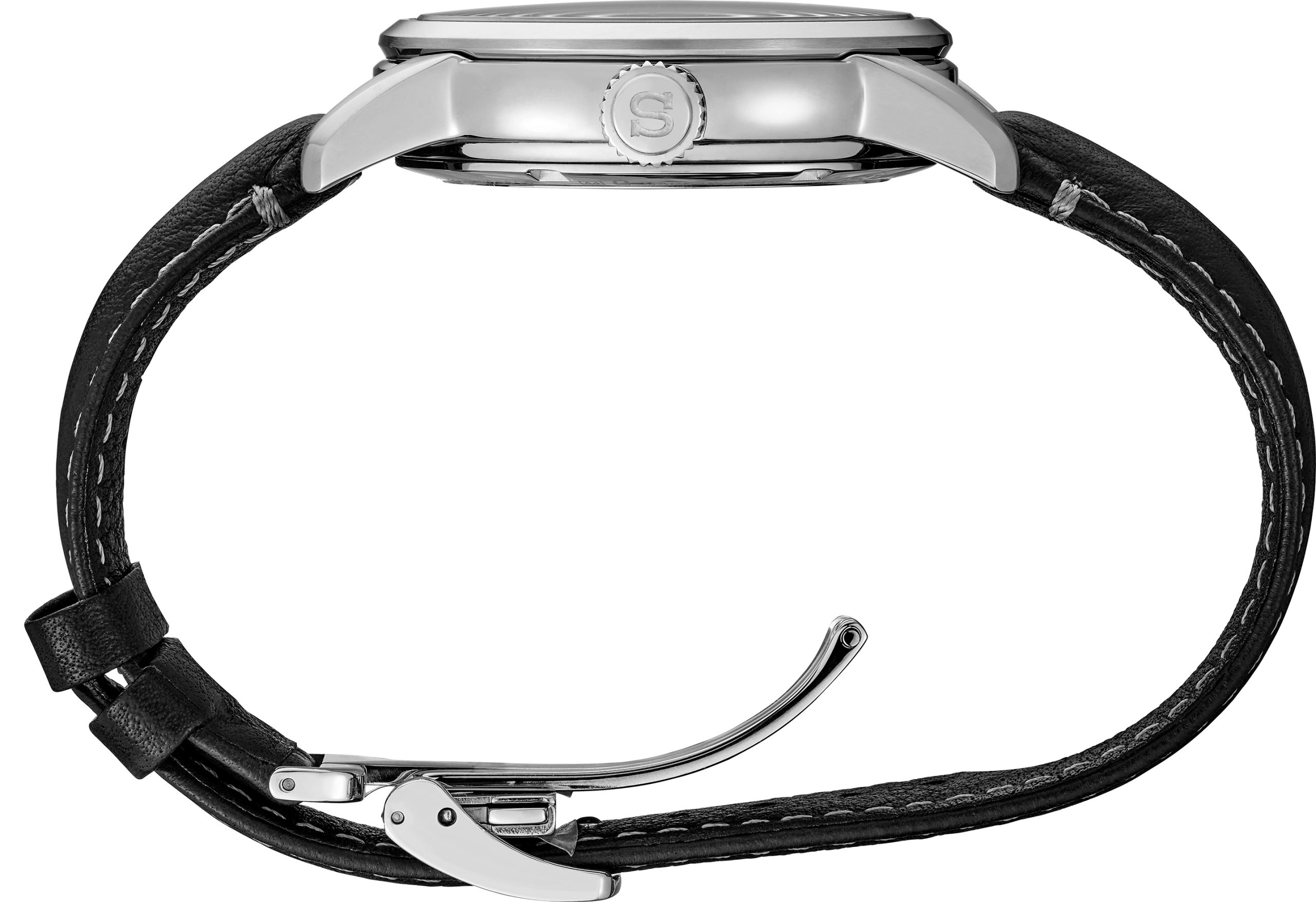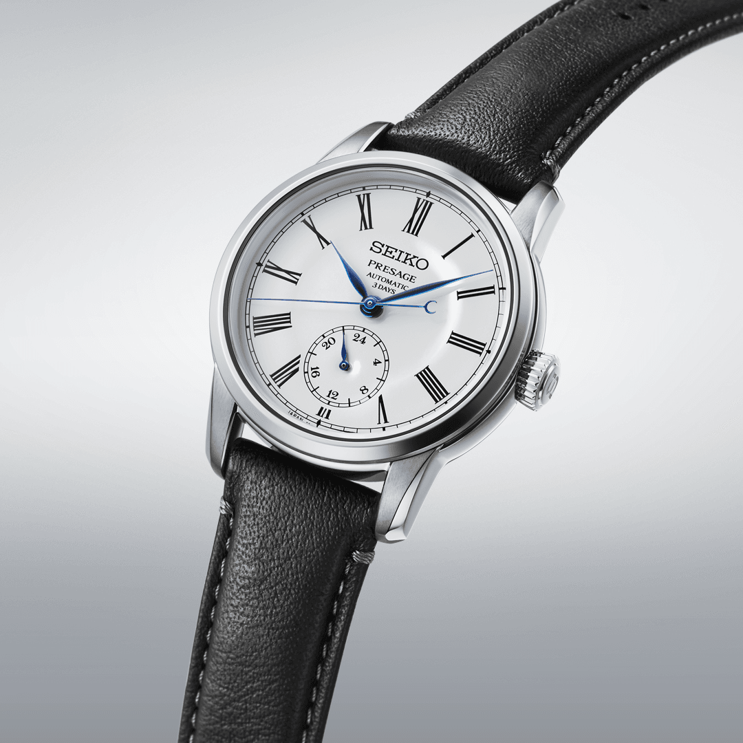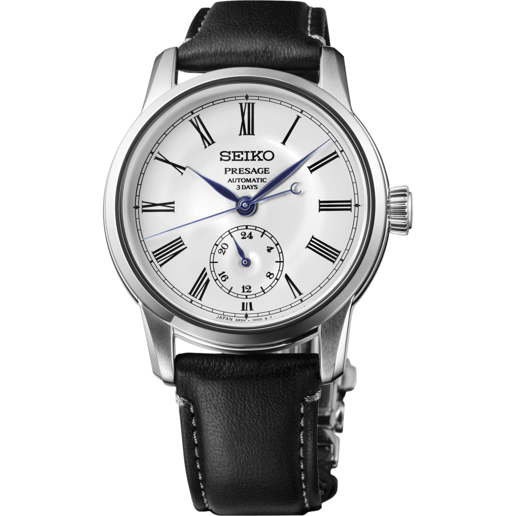 Presage Craftsmanship Series Enamel. Offering the finest in Japanese mechanical watchmaking, the Presage Collection blends precision technology with superior craftsmanship and design. In glossy white enamel with blue accents, the beautifully finished dial features a 24-hour subdial at 6 o’clock and curved hands providing a soft, luxurious impression. The thin roman numerals give a minimal, elegant, and contemporary impression while the crescent accent at the end of the second hand symbolizes the moon, a traditional element of Japanese art. The 24-jewel automatic movement beats at a frequency of 21,600 vibrations per hour, with a power reserve of 72 hours and manual winding capability. Crafted of stainless steel with super-hard coating, and paired with a black leather strap, this extraordinary timepiece includes a dual-curved anti-reflective sapphire crystal and a tri-fold push-button release clasp. 10 bar, 100M Water Resistant