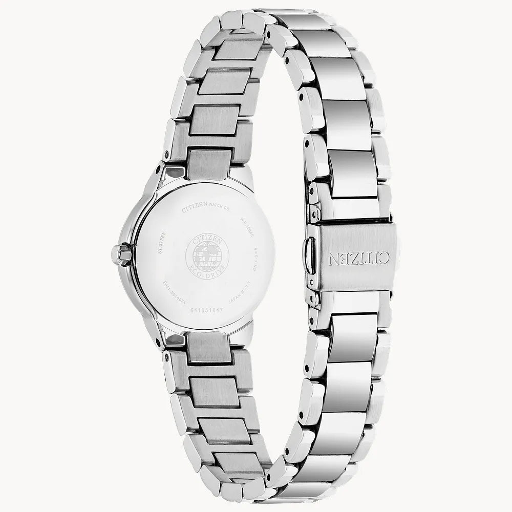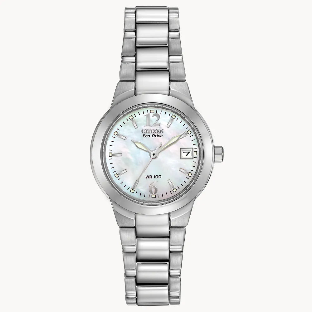 The surprise of a mother-of-pearl dial lends this ladies' sport watch a extra feminine touch. Ever practical, this stainless steel 3-hand model with 26mm case also features luminous hour and minute hands, a date indicator, foldover clasp with push-button, and 100 meter water resistance. Featuring our Eco-Drive technology – powered by light, any light. Never needs a battery. Caliber number E011.