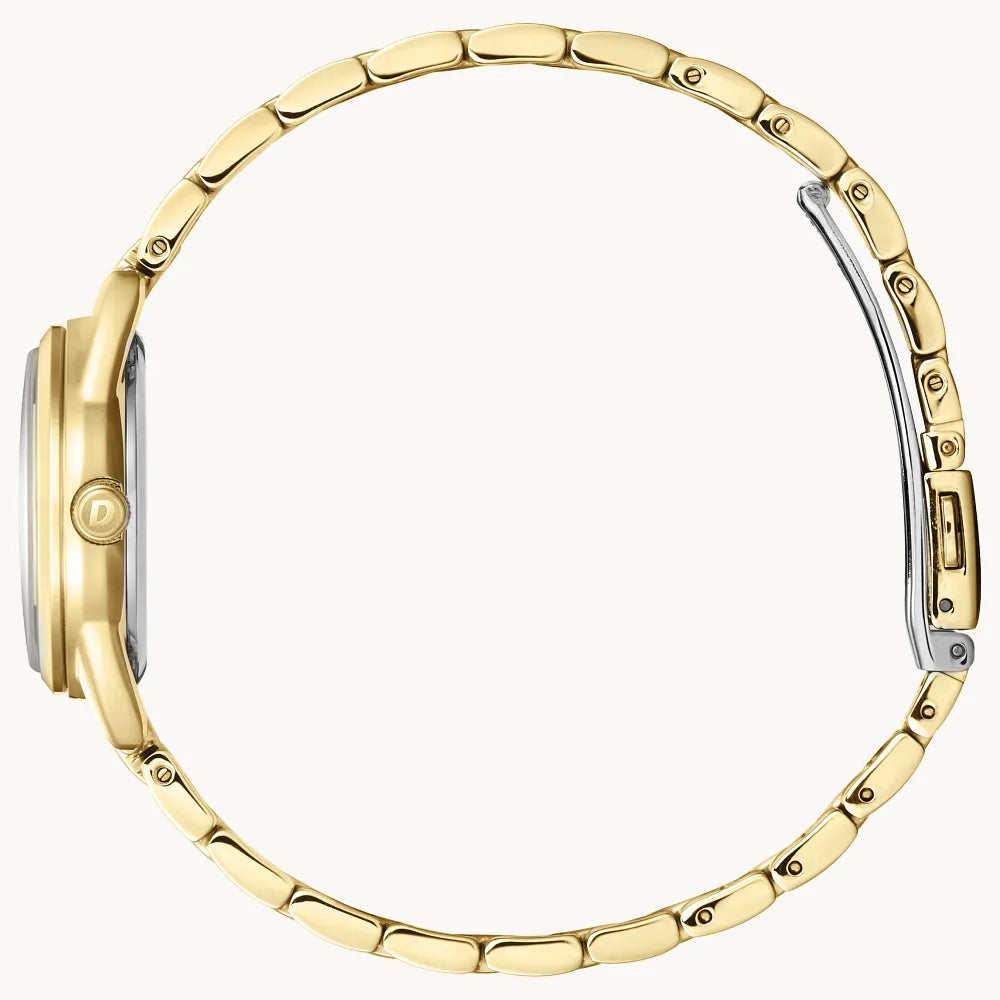 This Ladies’ Drive watch from Citizen is a “mini” version of the timeless classic. The graceful style features a gold-tone stainless-steel bracelet, a crisp white face with easy-to-read numerals and a gold-tone three-hand dial. It is the perfect choice for a daily-wear watch that will always work flawlessly, as it’s equipped with our patented Eco-Drive technology.