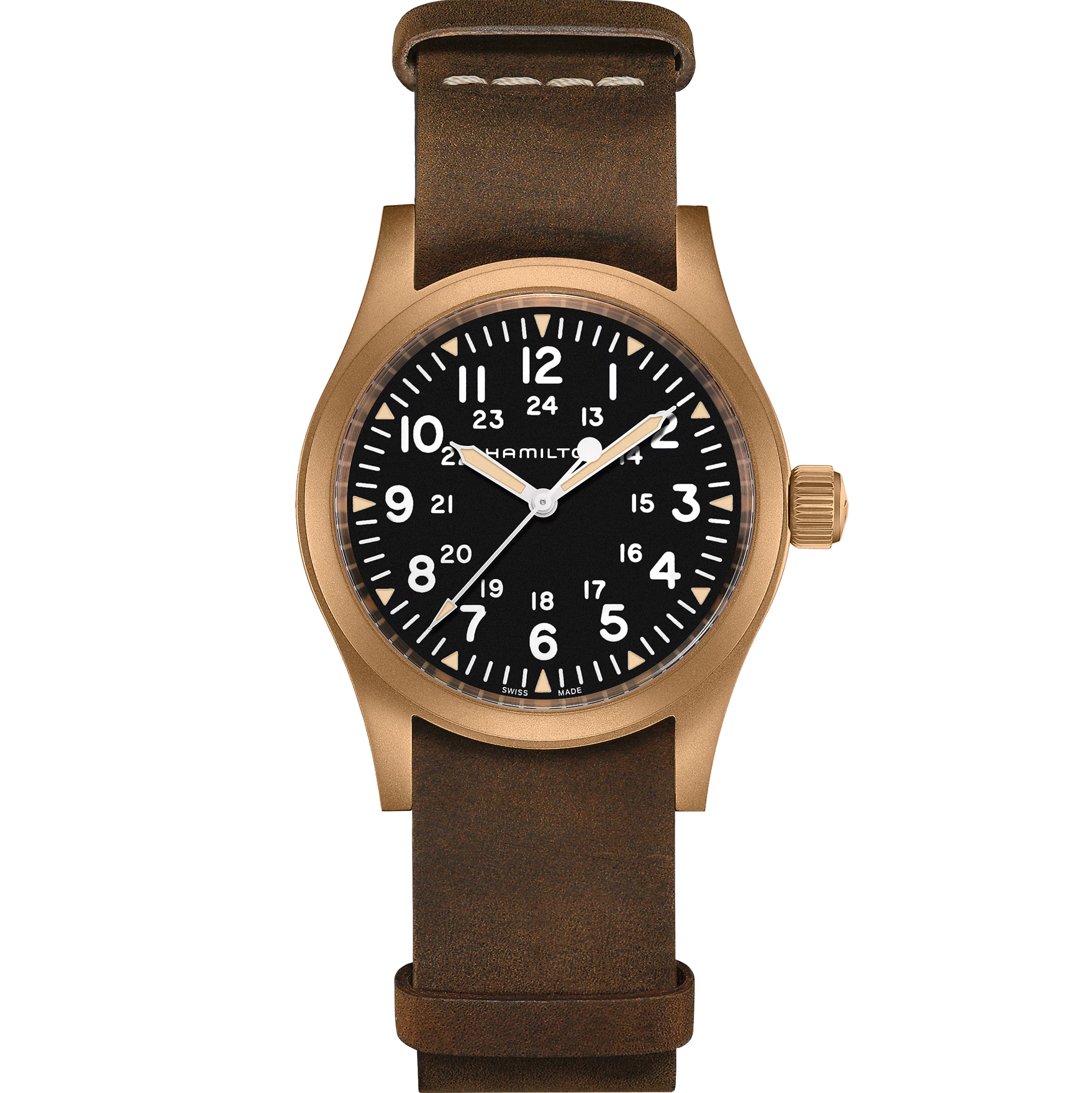 The original soldier's watch gets an original upgrade with Hamilton's first-ever bronze case. Each Khaki Field Mechanical Bronze has a unique story that will unfold with each wear as its case develops a distinct patina over time. Powered by our exclusive hand-wound H-50 movement, fitted to a titanium case back and matched with a soft brown leather NATO strap, this authentic 38mm favorite celebrates Hamilton's military heritage with an eye towards the future. What story will your field watch tell?
