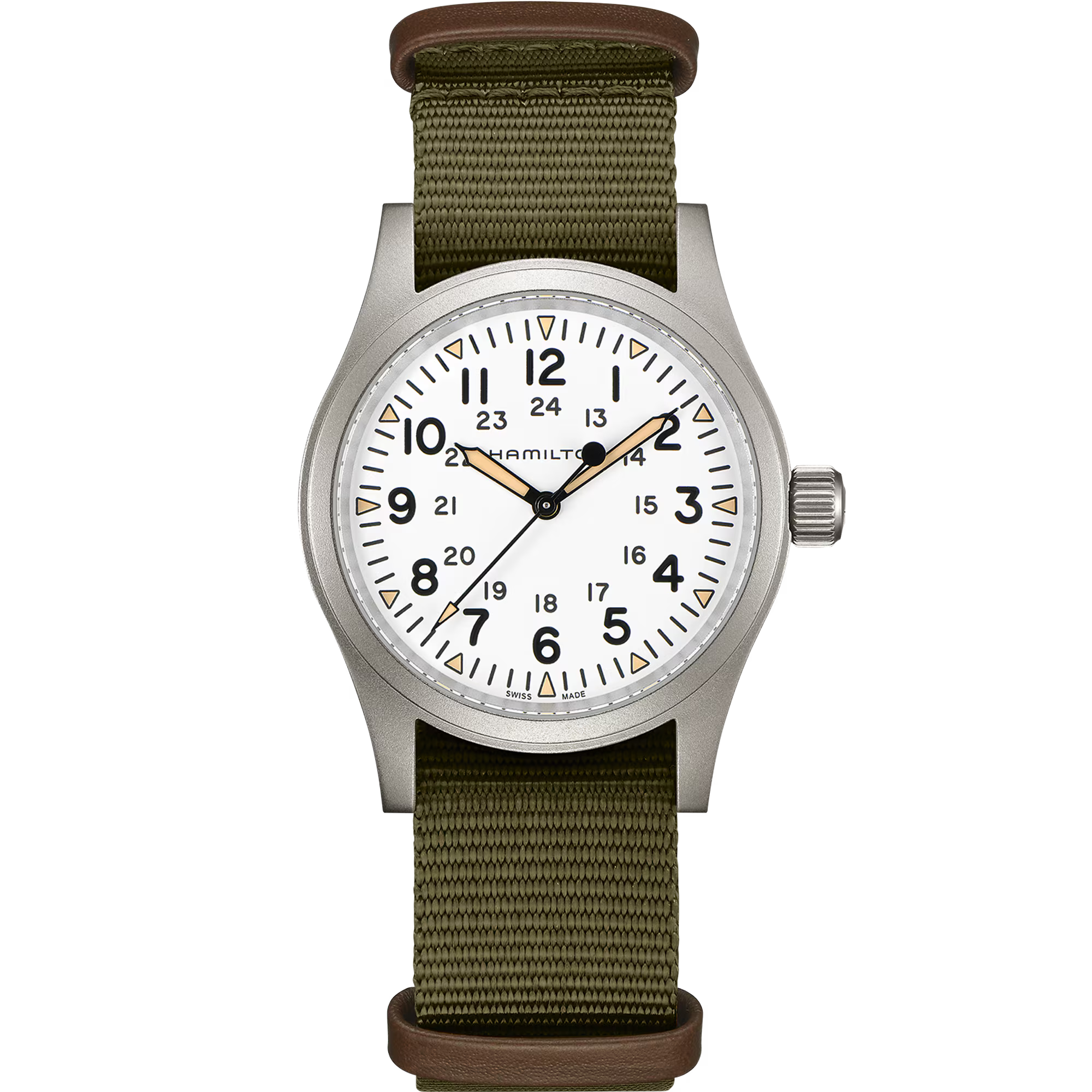 38mm matt stainless steel case, three hand display, white dial, triangular indexes with old radium color Super-LumiNova, durable NATO strap: The new Khaki Field Mechanical is a faithful recreation of its original 1960s forebear and is true to Hamilton's military heritage. Inspired by the military, built to last, this is the original soldier's watch.
