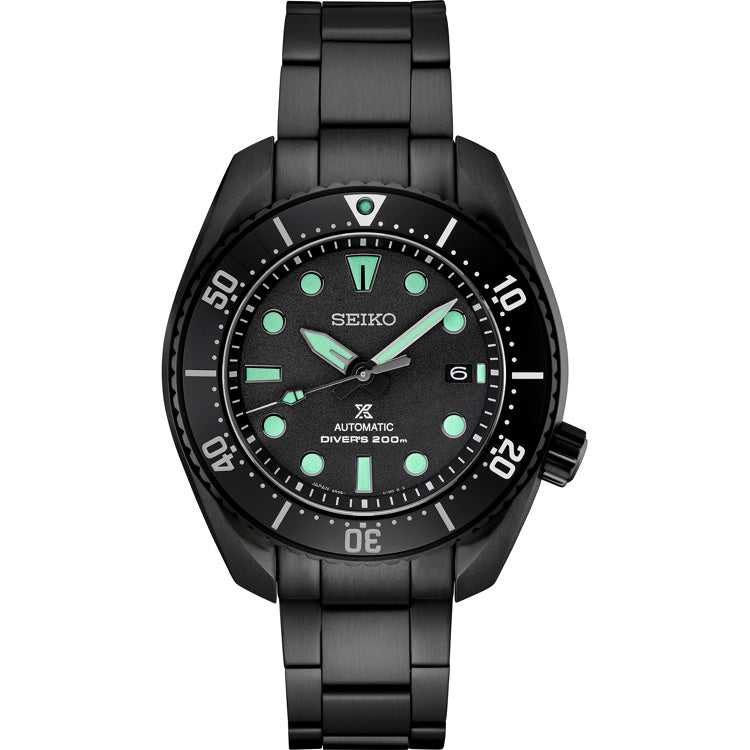 Prospex Black Series Limited Edition. Designed for those who treat life as the ultimate adventure, the Seiko Prospex line meets every challenge with technological excellence and style. Part of a rich legacy of innovation in high-intensity timekeeping, Prospex continues to celebrate a long history of sports watch excellence with re-creations and re-interpretations of landmark achievements. Based on an iconic design, this extraordinary Black Series Limited Edition, available only in a controlled-production run of 3,500 with the serial number engraved on each caseback, expresses the view seen through a night vision scope, and features hands and markers with Seiko’s brighter and longer lasting “Green LumiBrite Pro,” suitable for professional usage and providing maximum visibility with the color most recognizable in the dark. Following ISO standards for scuba diving to depths of up to 200 meters, this exceptional timepiece includes a 24-jewel automatic movement with a frequency of 21,600 vibrations per hour, a power reserve of approximately 70 hours and manual winding capability. In stainless steel with black hard coating, this dramatic watch includes a black dial, date calendar, curved sapphire crystal with anti-reflective coating on the inner surface, screwdown crown and caseback, black uni-directional rotating elapsed timing bezel and a tri-fold push button release clasp with secure lock and extender. 200m Water Resistant