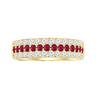 This three row ring is crafted with 18K yellow or white gold and features a stunning combination of .48ct round diamonds and .30ct round rubies. Elevate your jewelry collection with this elegant and eye-catching piece.