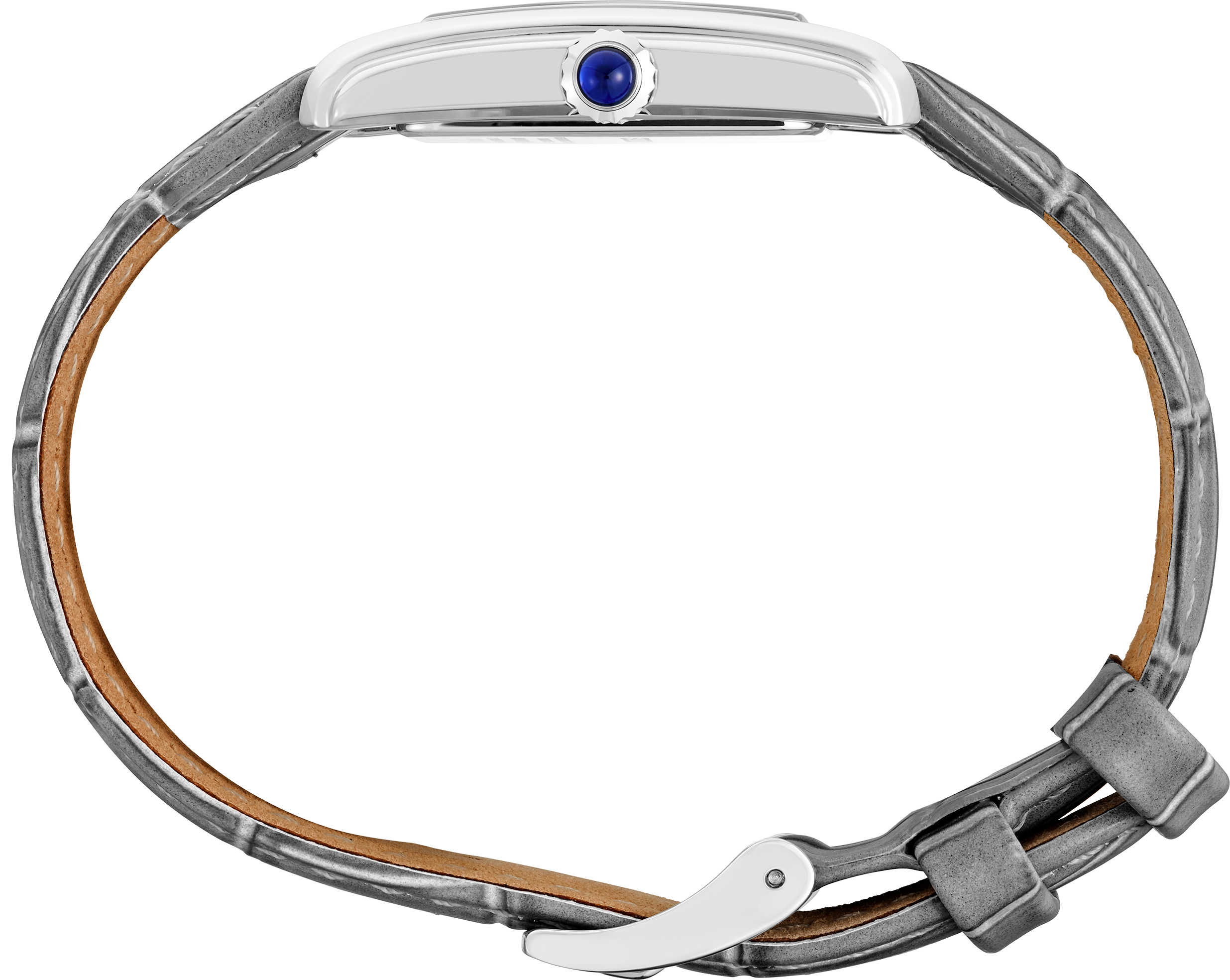 From the Essentials Collection. A contemporary classic, beautifully proportioned for a streamlined feel, this elegant watch offers a white mother-of-pearl Roman numeral dial, blue hands, and a blue cabochon crown. With a sleek rectangular case crafted of stainless steel, the graceful design includes a soft gray leather strap for superb comfort and sophisticated style. 5 bar, 50m Water Resistant