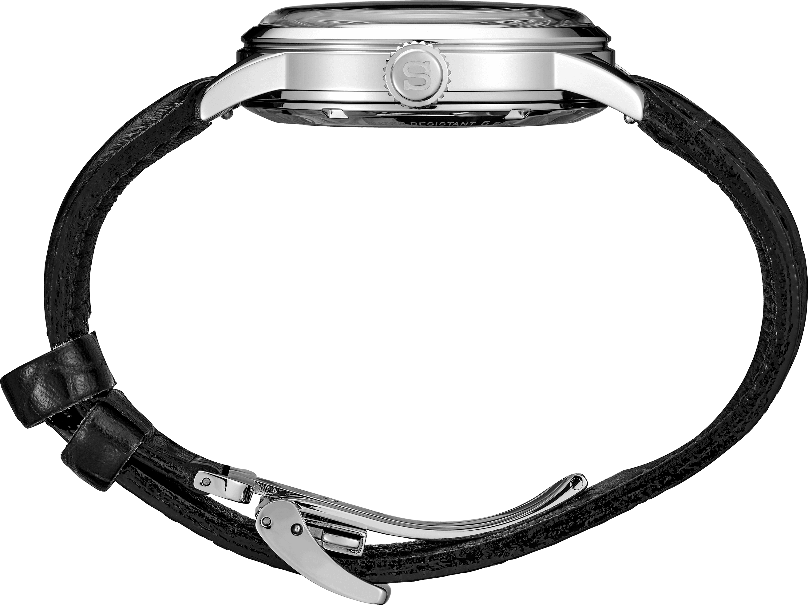 Presage Cocktail Time GMT. Offering the finest in Japanese mechanical watchmaking, the Presage Collection blends precision technology with superior craftsmanship and design. Inspired by the vibrance of the city’s modern lounges, the newest Cocktail Time designs express the excitement of today’s Tokyo, with fresh styling and colors. Evoking the Rusty Nail cocktail, the dark brown gradated dial features a deep pressed pattern with a lustrous gloss finish accented with a gold-tone GMT hand designed in the shape of a cocktail glass, while beautifully displaying a cursive-style Arabic numeral 24-hour scale. The 24-jewel automatic GMT movement, visible through the screwdown see-through caseback, beats at a frequency of 21,600 vibrations per hour with a power reserve of approximately 41 hours. Crafted of stainless steel and paired with a black leather strap, this distinctive timepiece includes a date calendar, box-shaped crystal, and tri-fold clasp with push button release. 5 bar, 50M Water Resistant