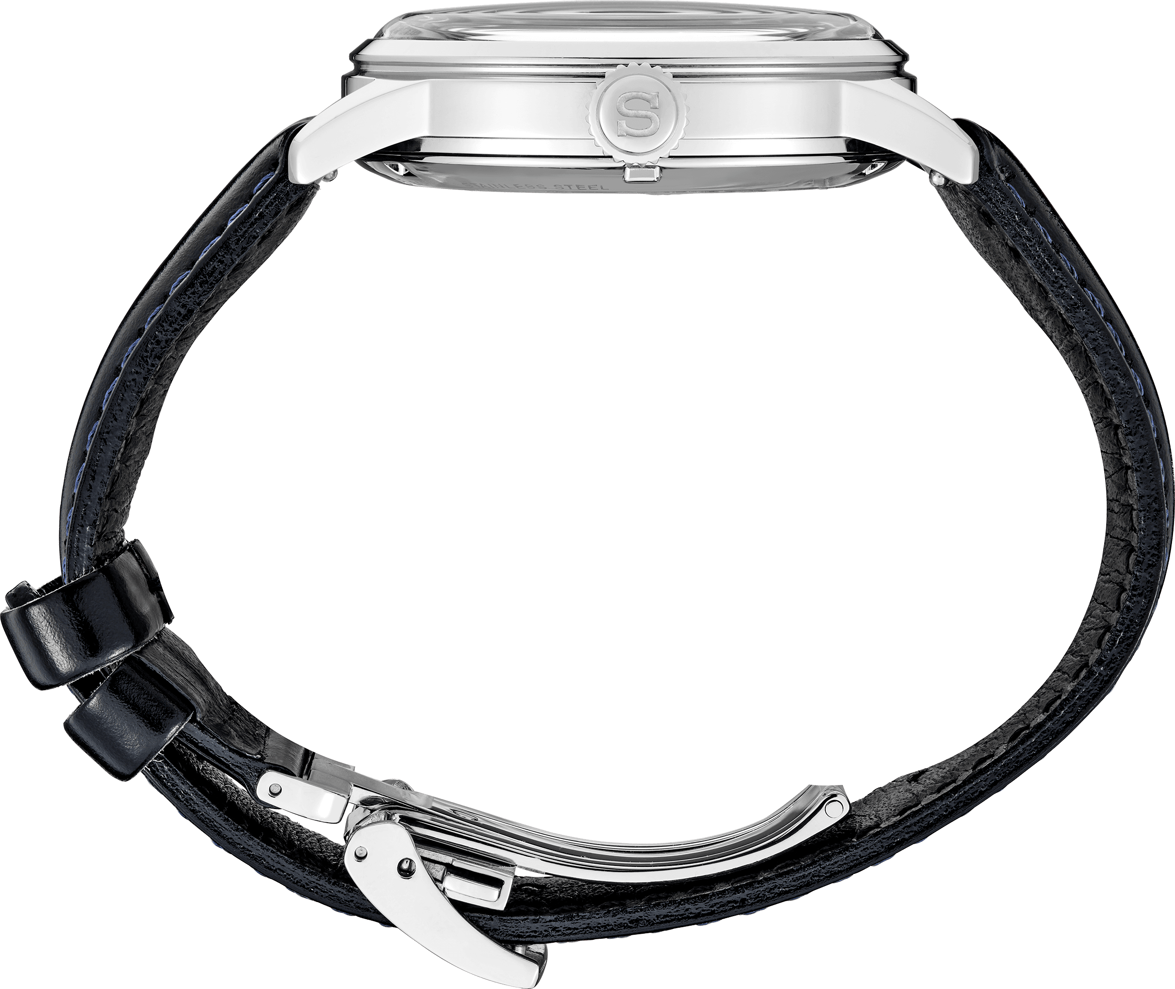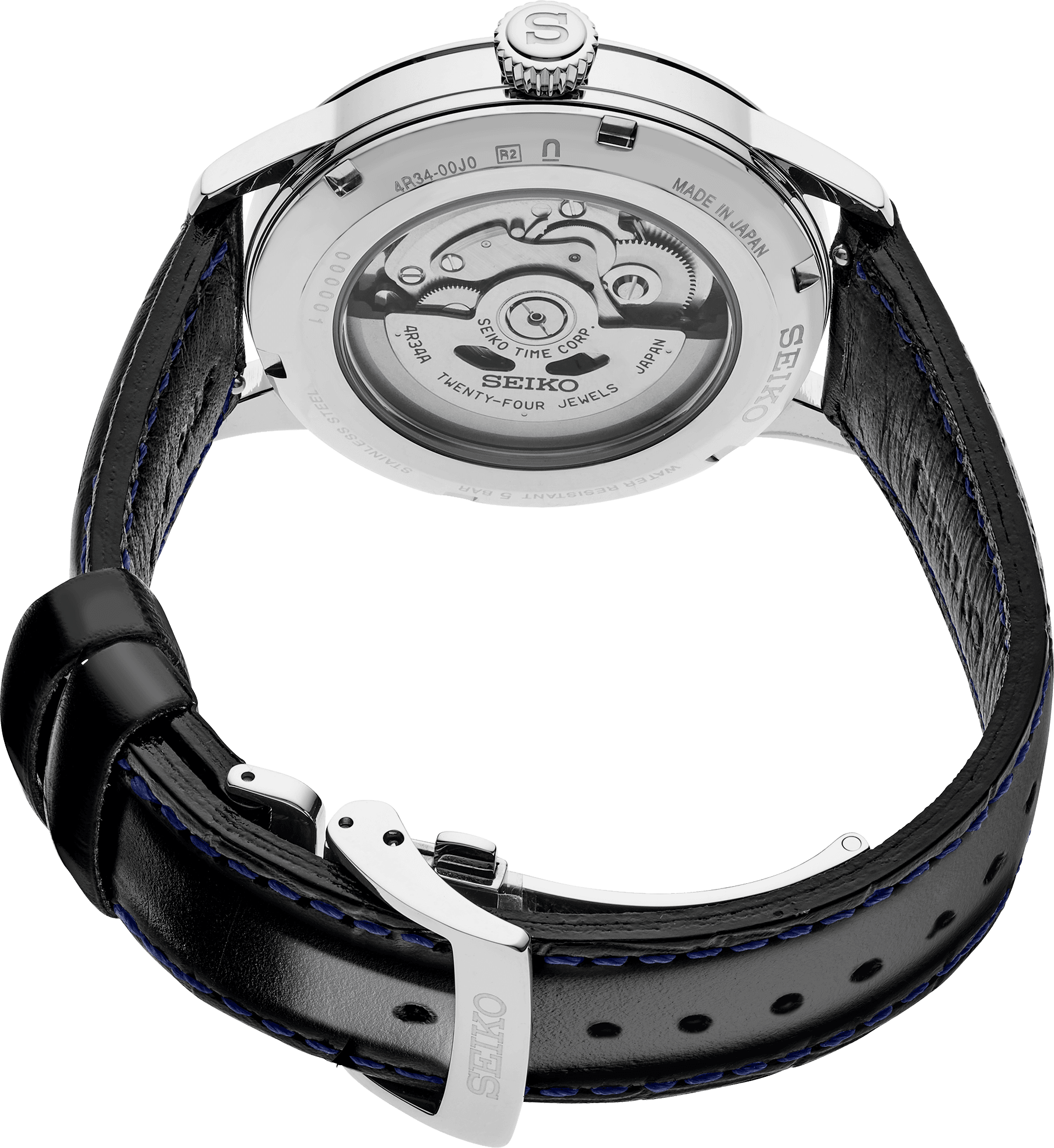 Presage Cocktail Time GMT U.S. Special Creation. Offering the finest in Japanese mechanical watchmaking, the Presage Collection blends precision technology with superior craftsmanship and design. Evoking the Silver Bullet cocktail, the vintage-tone silver dial features a deep pressed pattern with a lustrous gloss finish, accented by a deep blue GMT hand shaped like a cocktail glass and a gold-tone second hand. A blue cursive-style Arabic numeral 24-hour scale adds refined character. Powered by a 24-jewel automatic GMT movement beating at 21,600 vibrations per hour with a power reserve of approximately 41 hours, the movement is visible through the screwdown see-through caseback. Crafted of stainless steel, this distinctive timepiece includes a date calendar, box-shaped crystal, and a dark blue leather strap with a tri-fold push button release clasp.
